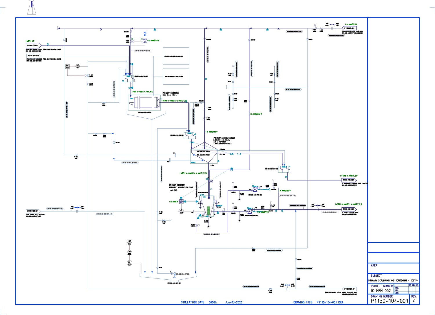 Constructing full-scale plant simulations (digital twin) that mirror real-world mineral-processing plants: combining flowsheet modelling, chemical reaction modules (if needed), dynamic control logic, interlocks, start-up/shutdown sequences, transients, etc.